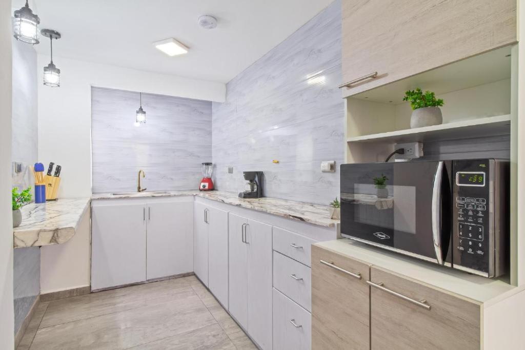 The apartment includes a private bathroom equipped with a hairdryer. The fully equipped kitchen features a stovetop, a refrigerator and a microwave. The spacious apartment provides air conditioning, a private entrance, a tea and coffee maker, video games and a TV with streaming services.